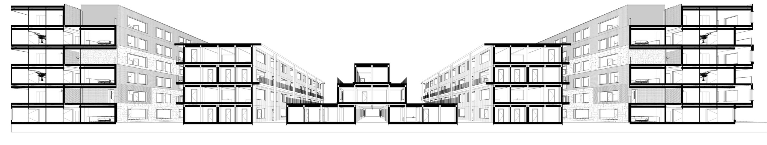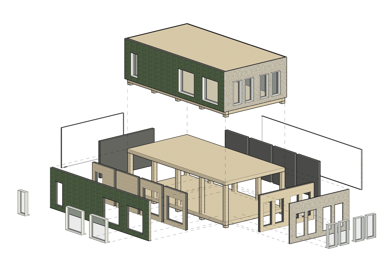 De modulaire unit van 6 bij 12 meter is opgebouwd met een CLT (cross laminated timber) skelet constructie, HSB binnenbladen en een gestandaardiseerd gevelafwerkingssysteem. Het voordeel hiervan is dat de basis van het blok volledig geprefabriceerd is en hergebruikt kan worden. Voor iedere unit wordt er gebruik gemaakt van duurzame materialen. Door de gevels en de platte daken af te werken met beplanting brengen wij de natuur die verloren gaat voor de bouw van de woningen terug.